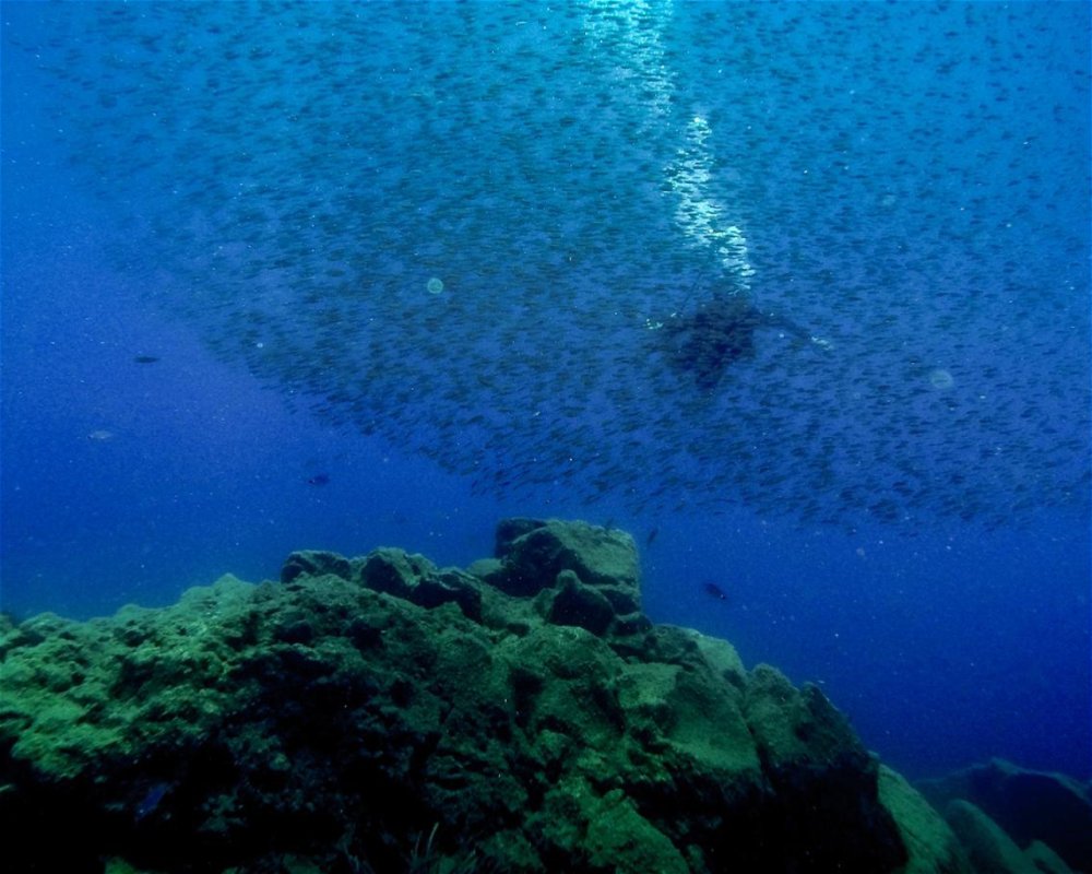 Το σχήμα του σπηλαίου δημιουργεί ένα εντυπωσιακό τοπίο προς το γαλάζιο της ανοιχτής θάλασσας. Στο δρόμο της επιστροφής, μπορείτε να εξερευνήσετε τσέπες στον τοίχο, όπου ένα τεράστιο λιβάδι του Neptune χόρτο (που δείχνει πόσο καθαρά είναι αυτά τα νερά) είναι το σπίτι για μύδια ανεμιστήρα, nudibranchs, ψάρια σωλήνα και πολλά άλλα.