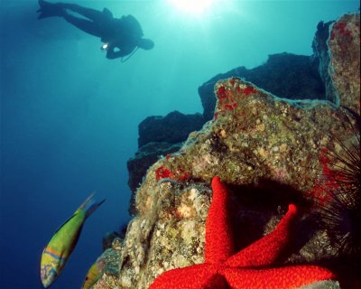 The furthest dive site from the coast. Huge rock formations form gorges, drop-offs, and openings. There are hundreds of opportunities to dive this site. The black fissured lava formations stand out against the white sandy bottom.