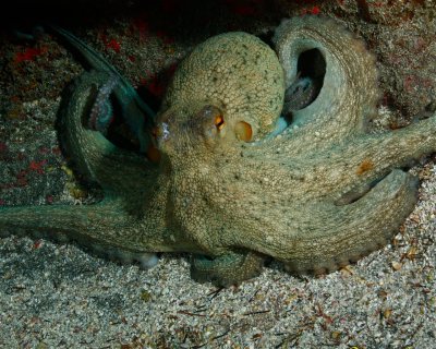 As part of the Salinas Reef, the rugged cliff wall goes from 6m water depth to 35m where it merges into the sloping sandy bottom. In front of it, huge boulders rise, which are covered with sponges. In the northern part a deep grotto goes under the reef at the bottom of the wall.