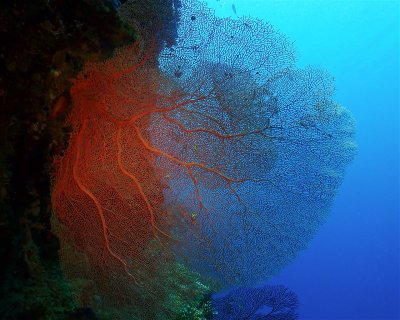 This dive site is a flat area with soft coral at a depth of 5 meters, followed by a wall that reaches approximately 35 meters. This site is covered by large sea fans and several other types of coral.
