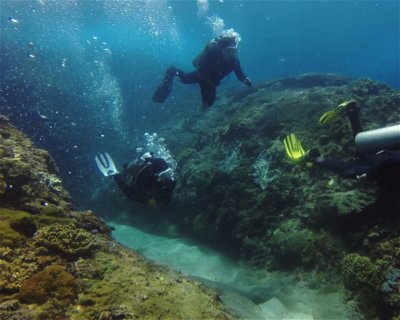 A combination of coral reef with sandy rubble that forms a long slope and meets the wall at the end of the dive. The wall rises from a depth of 25 meters to 3 meters below the surface. Usually the dive will end in the blue lagoon bay with soft coral formations at a depth of 5 meters.