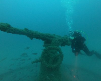 The wreck lies at a depth of 44m, and it’s possible to dive around the castle and discover the galley. The front of the castle marks the break-up of the ship, and by following the wreckage you can reach the bow, where the anchors are still in place.