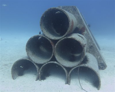 A large number of concrete sculptures (cubes, tubes, pyramids) form a great habitat for quite some sea life. The sandy bottom forms a great contrast with the sculptures. One of the 5 sites of the Artificial Reef.