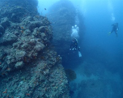 Located near Atami’s wreck, this dive site has fixed buoys with depths from 18-20m below the buoy. West side (No.1 root) stays ~20m deep; east side (No.2 root) deepens to 30m. Strong currents, rich fish schools, and varied terrain make it popular.