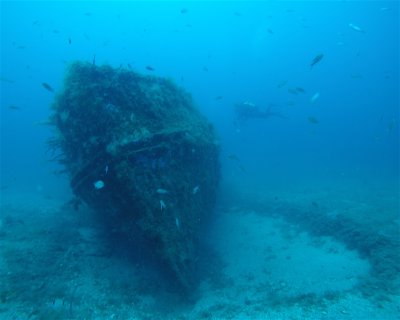 Magnificent shipwreck measuring 55m in length. A buoy allows you to moor the boat and reach the deck at 27m along the boute. The starboard side is covered with gorgonian sea fans, while the propeller, as large as or larger than a diver, is visible in the sand at a depth of 36m. On the port side, the wreckage.