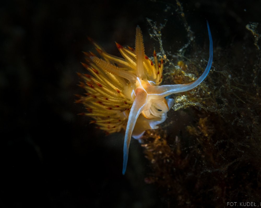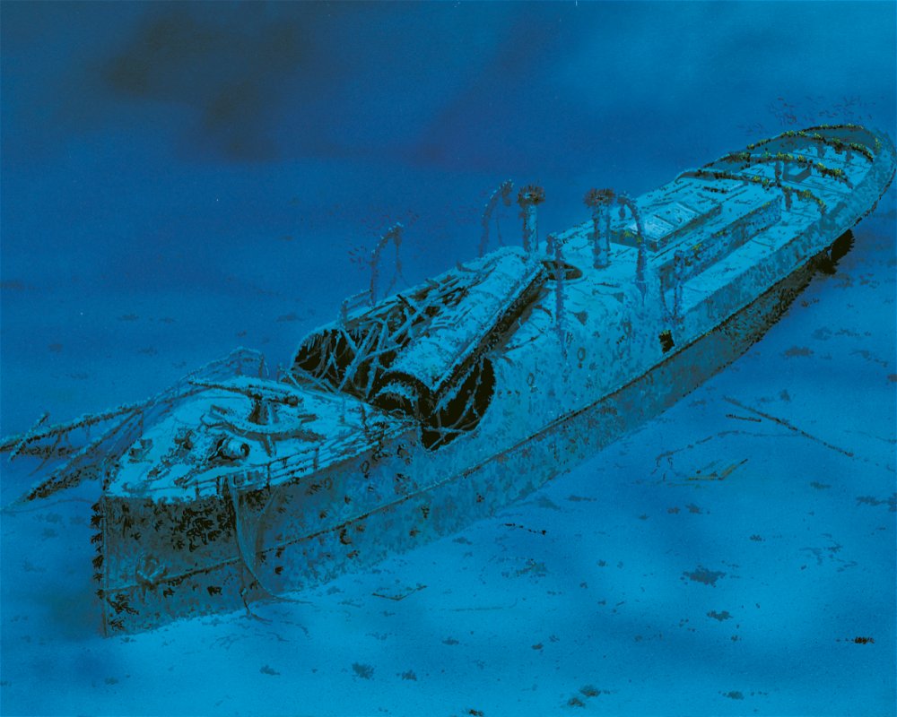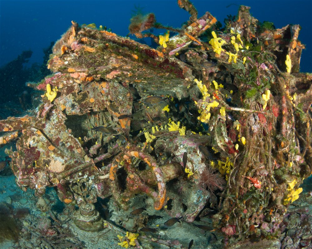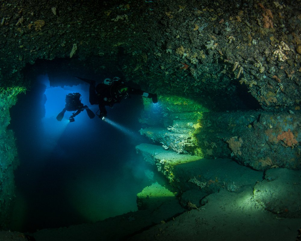 A well-preserved wreck of a fishing boat lying on the sandy bottom next to the steep wall, in which there is a long, narrow cave at the depth of 6 m.