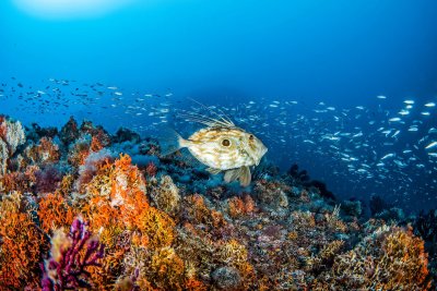 Among the numerous anemones we can spot nudibranchs, ornate and rainbow wrasse, octopus, combers, red mullets and sometimes larger groupers.